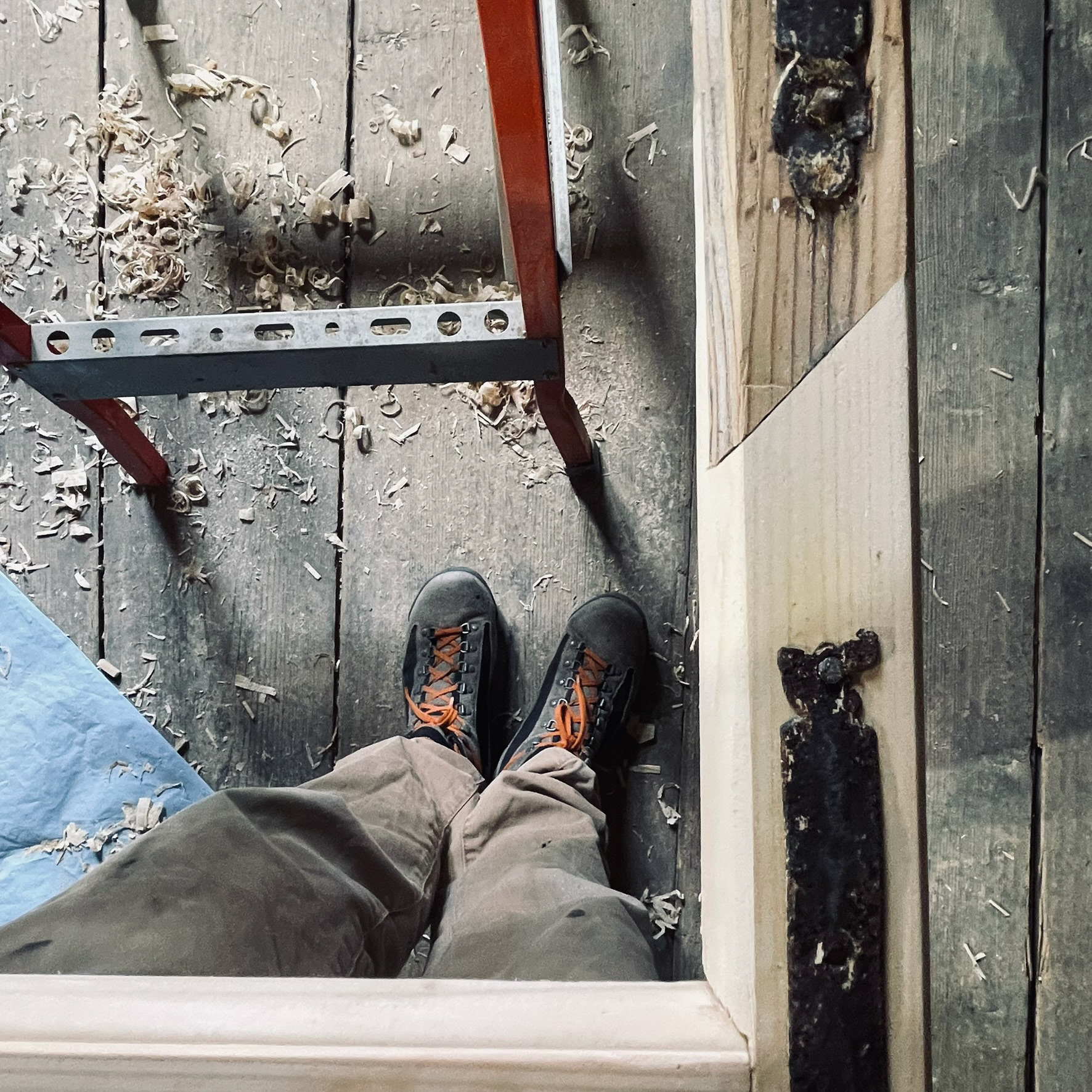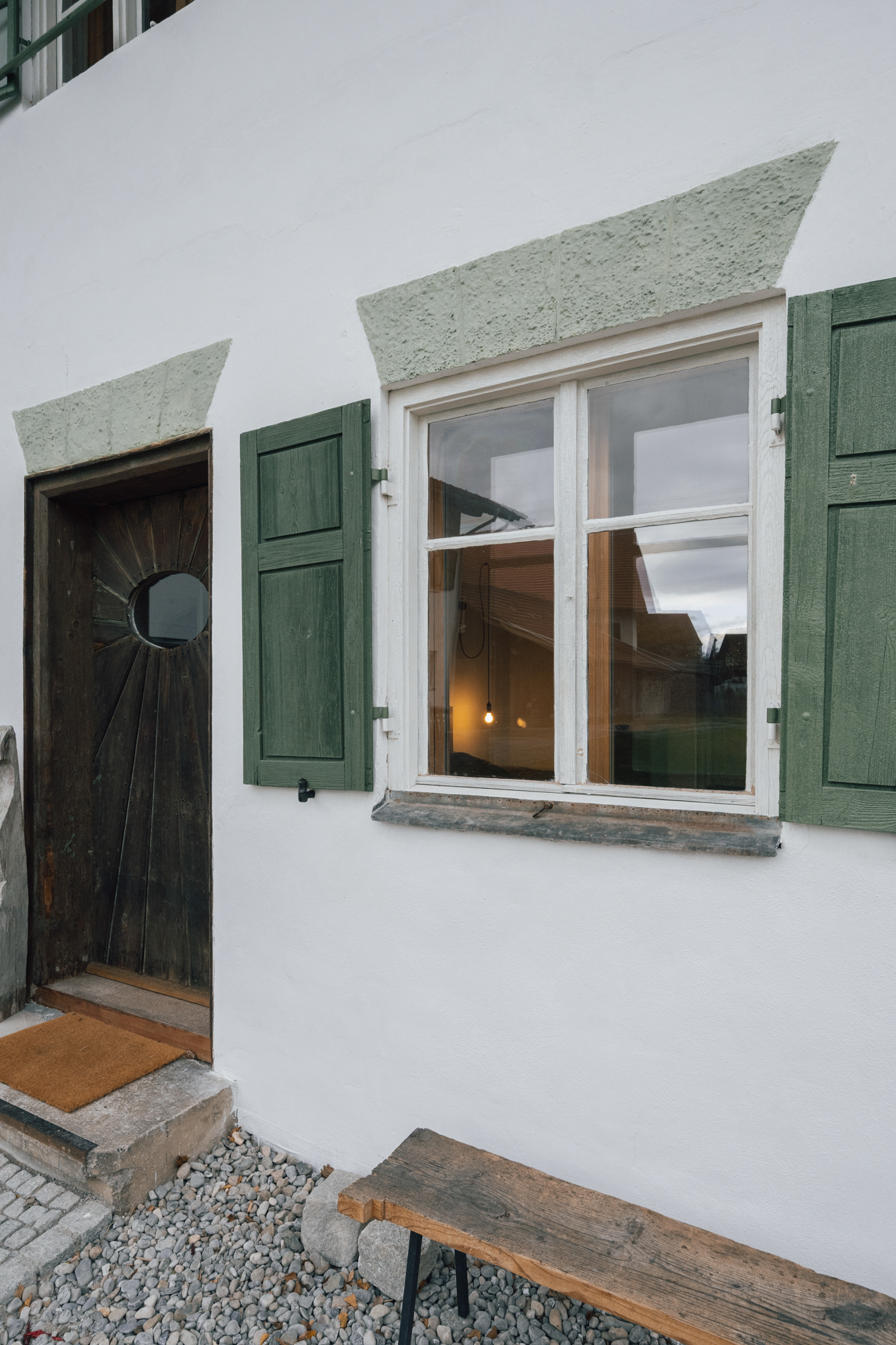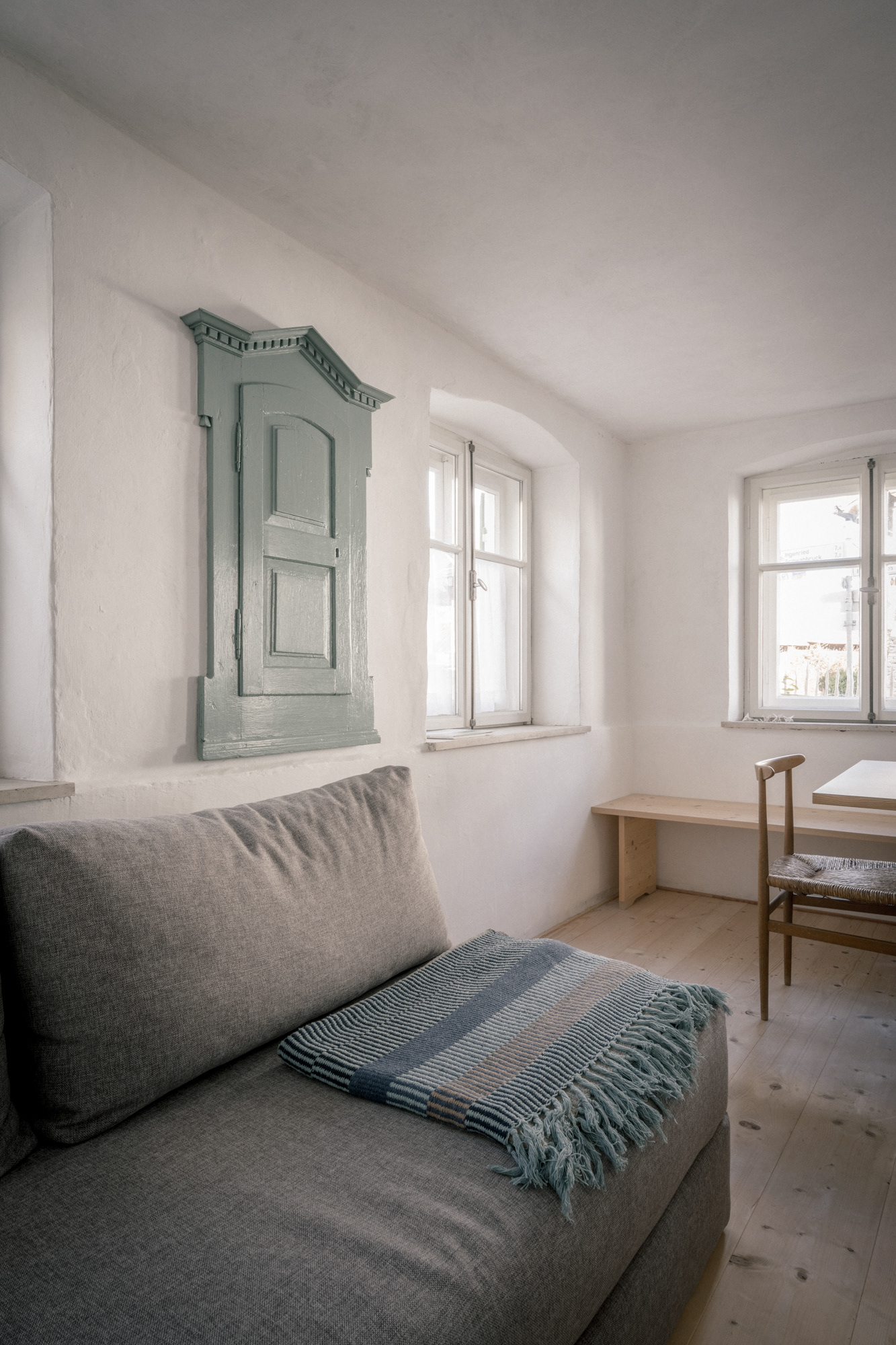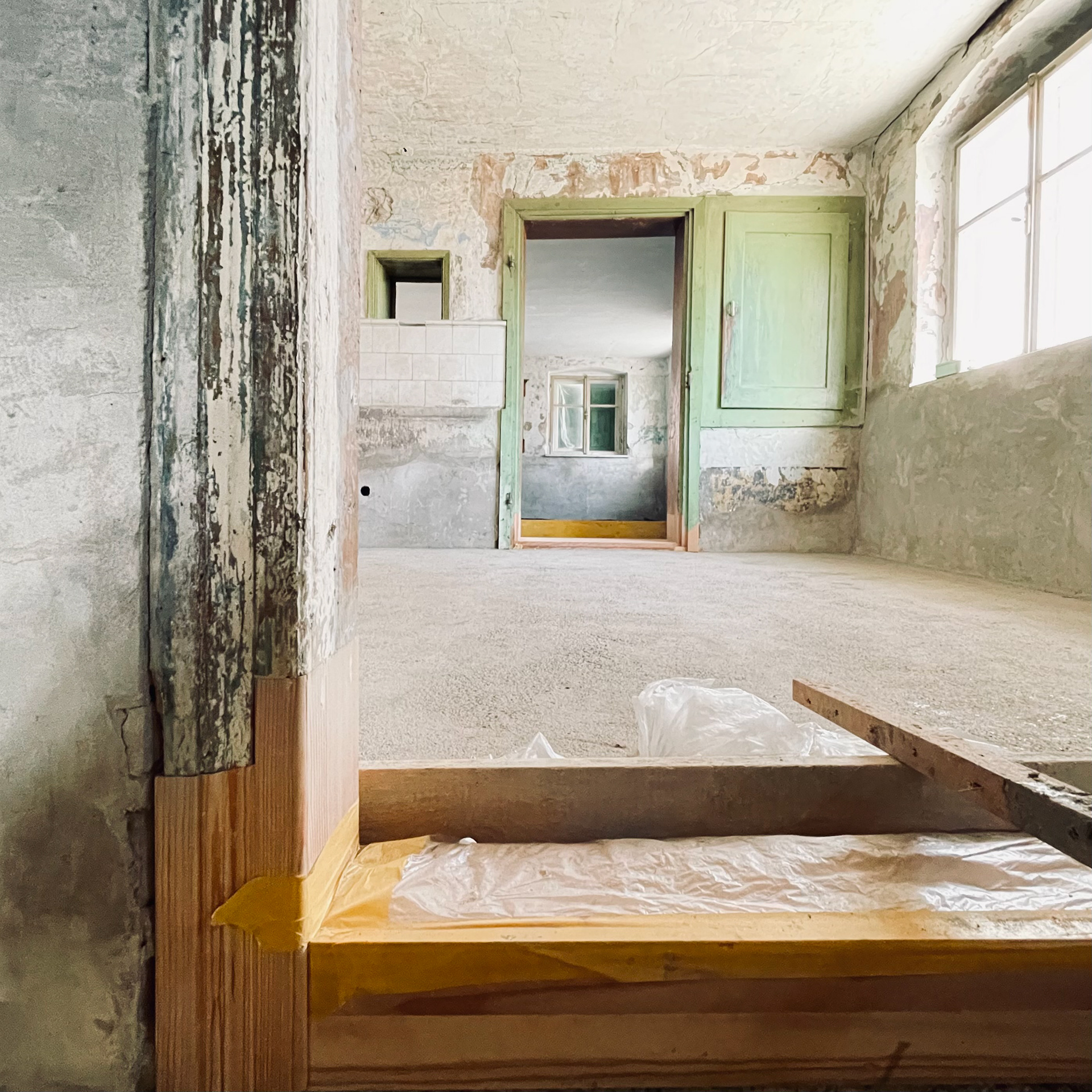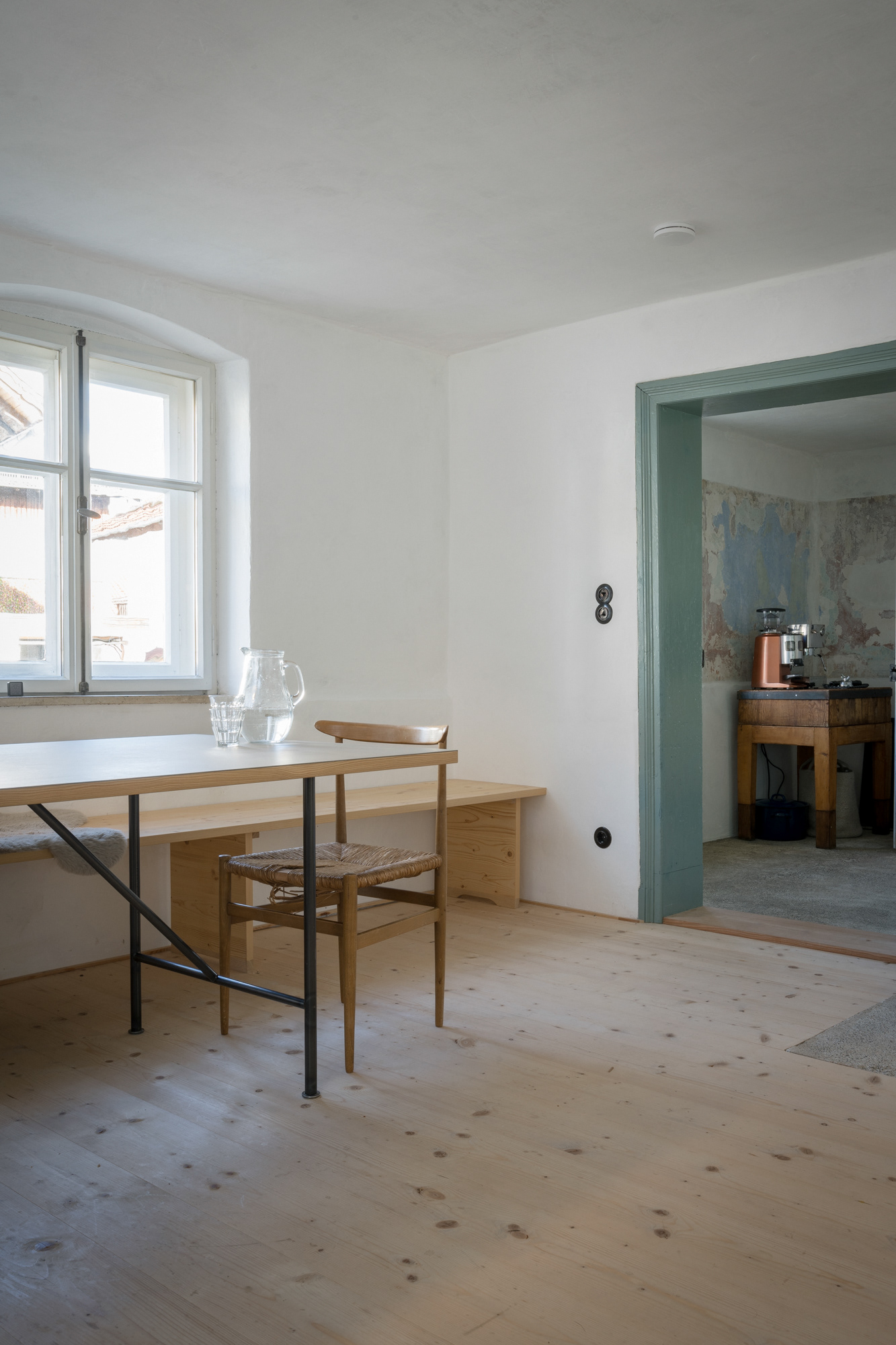 Historische Dielenböden wurden in Eigenleistung ausgebaut, aufgearbeitet und wiederverwendet, Innentüren repariert und wie die Fenster mit Leinölfarbe gestrichen. Altes wurde erhalten, neue Bauteile immer modern und erkennbar neu gestaltet.
