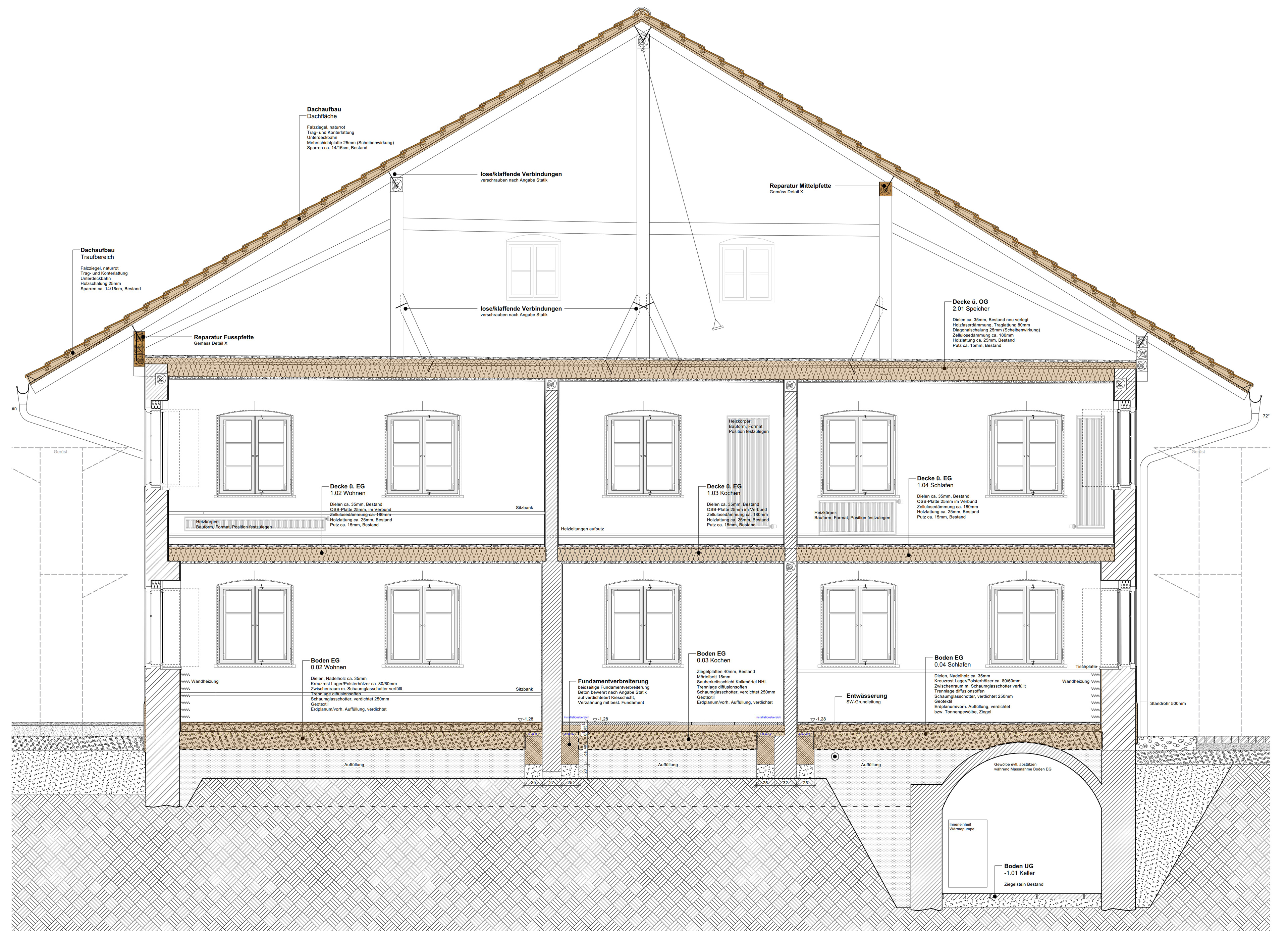 Um das Erscheinungsbild des Hauses nicht zu verändern und das beheizte Volumen auf das nötige Mass zu beschränken, sollte das Dach kalt bleiben. Gezielte Verbesserungen von Bauteilen wie die Wärmedämmung des Erdgeschossfussbodens, der obersten Geschossdecke und die energetische Verbesserung der teils bauzeitlichen Fenster halfen, den Energiebedarf zu reduzieren.