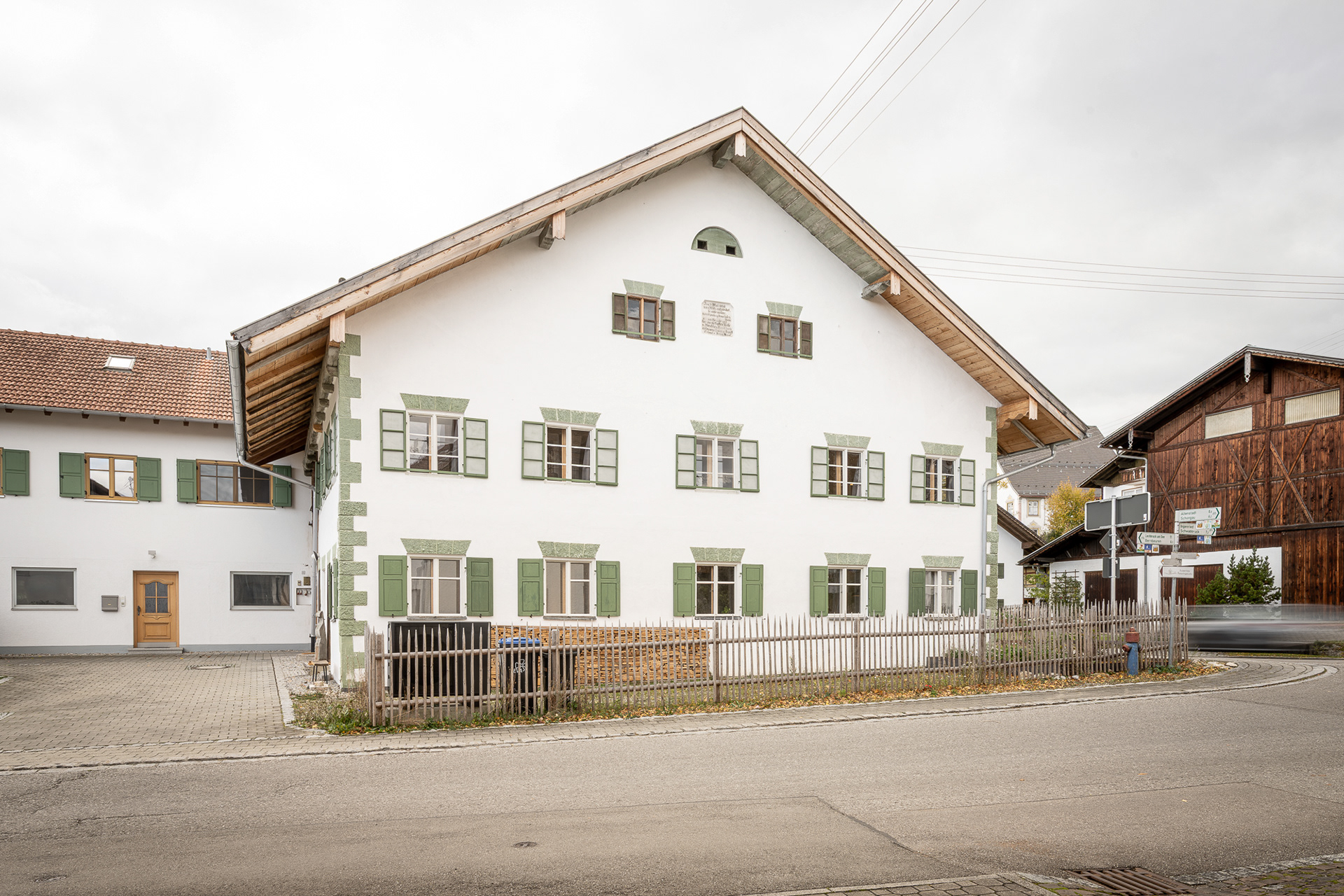 So steht es auf der Inschrifttafel am Giebel des denkmalgeschützten Bauernhauses, als wir es vor fünf Jahren in der Denkmalbörse des Bayerischen Landesamtes für Denkmalpflege entdecken. Historisch handelt es sich um einen Einfirsthof mit Tenne, mitten im Ort gelegen, von dem allerdings nur der Wohnteil zum Kauf angeboten wird. Das zweigeschossige Gebäude mit mittelsteilem Satteldach, Putzgliederung und Sterntüren stand rund fünfzig Jahre leer. Ein denkmalpflegerisches Vorprojekt klärt den Zustand des Hauses, prüft die erforderlichen Sanierungsmaßnahmen sowie mögliche Nutzungsszenarien und Fördermöglichkeiten. Trotz der zahlreichen Schäden bildet dieses Vorprojekt für uns die Grundlage für die Kaufentscheidung.