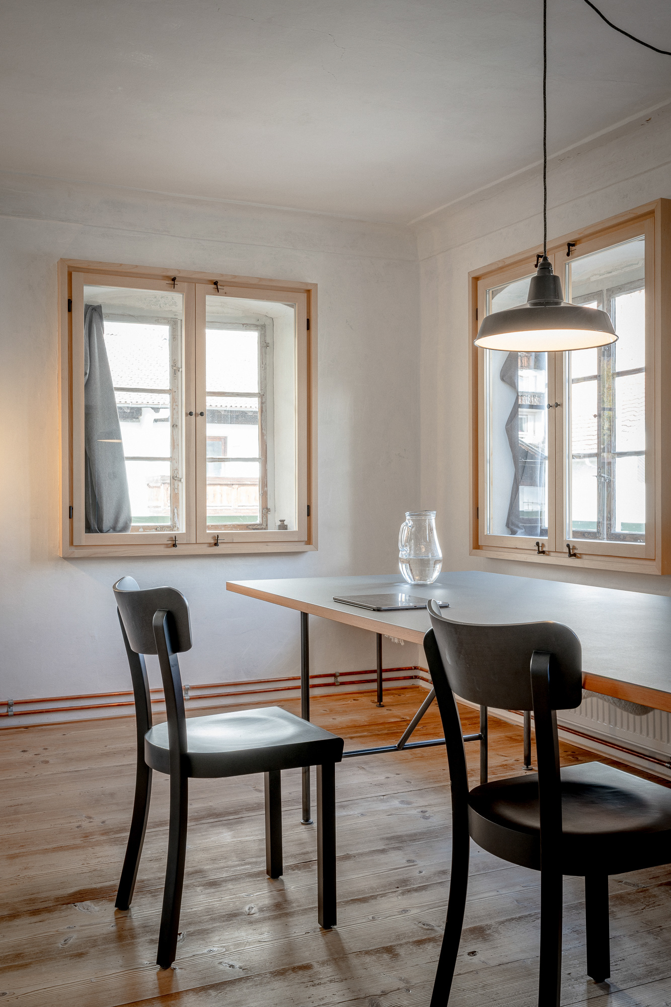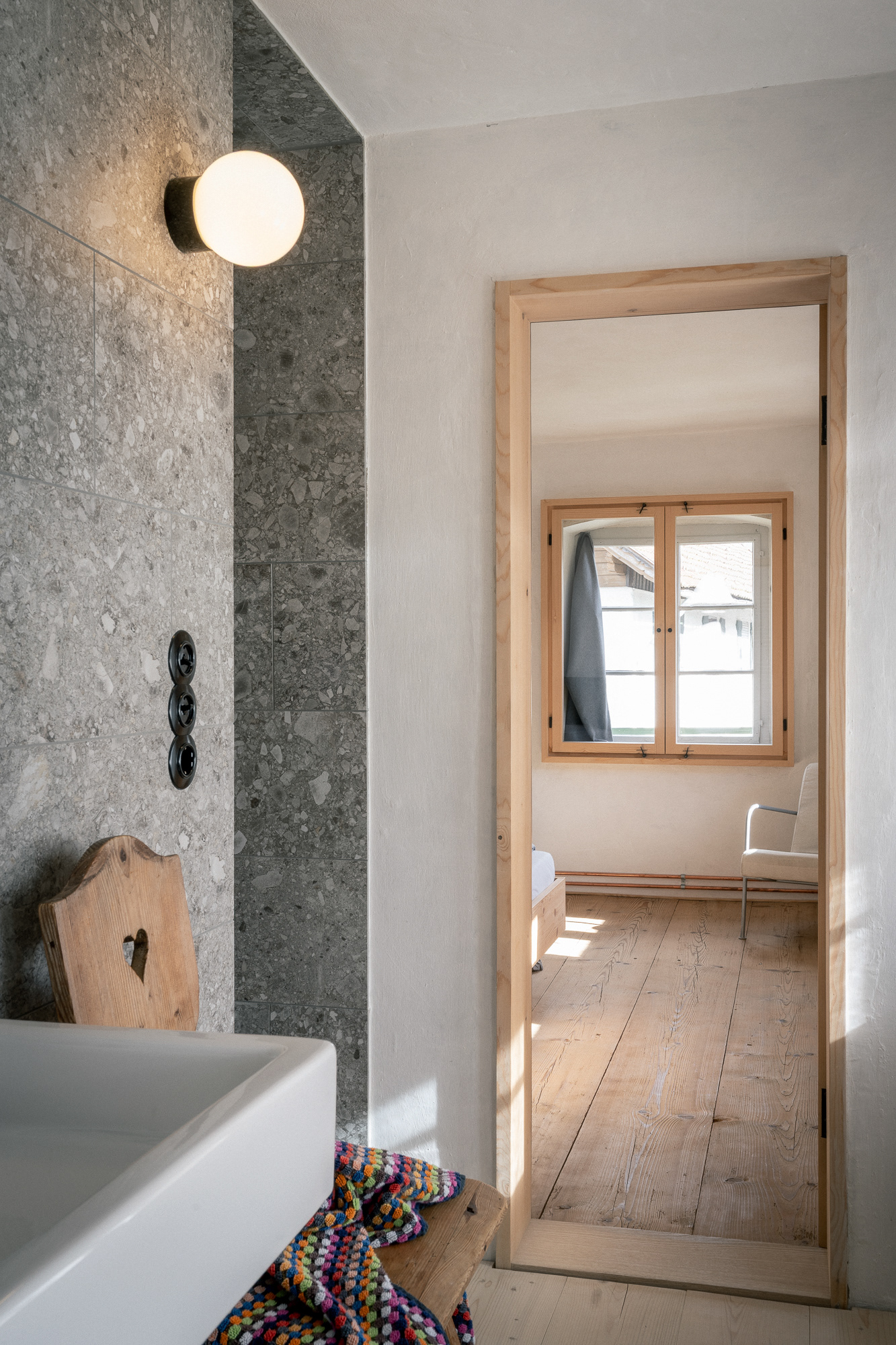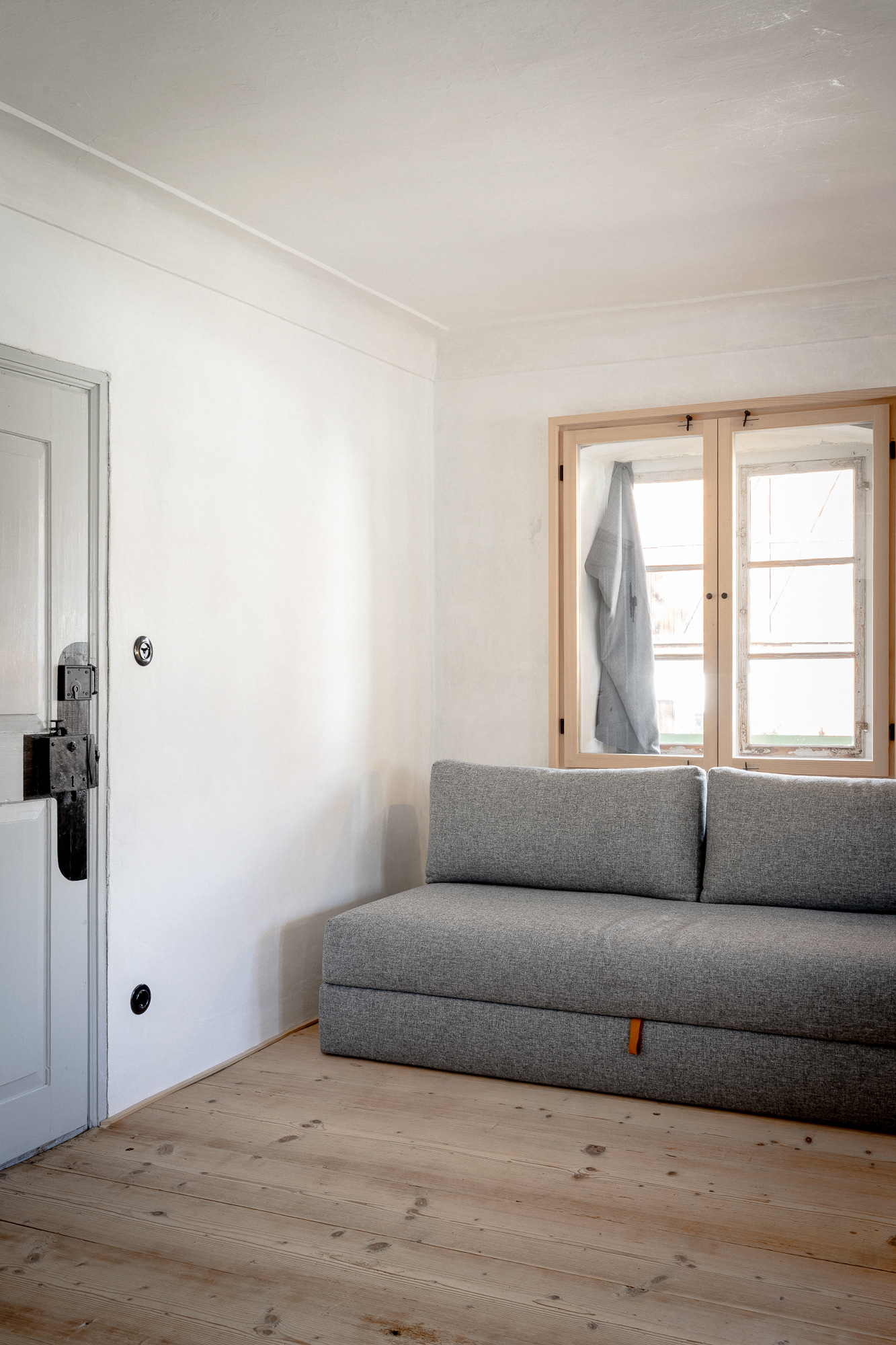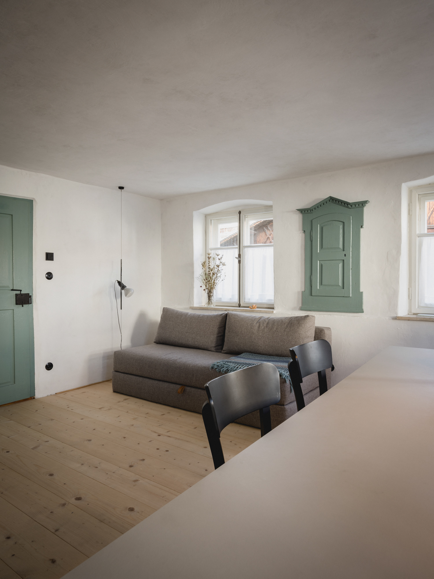 Im ehemaligen Bauernhaus wurden zwei Ferienwohnungen eingerichtet, jede mit eigenen Hauseingang. Durch die alte Tür an der Füssener Strasse gelangt man ins Haus, über eine hölzerne Stiege zur Ferienwohnung im Obergeschoss. In der geräumigen Stube gibt es einen großen Esstisch mit langer Sitzbank, ein komfortables Schlafsofa und einen wunderbaren Holzofen. Die schöne, große Küche ist gut ausgestattet und perfekt für alle, die gerne kochen. Das Schlafzimmer mit gemütlichem Doppelbett ist direkt mit dem Bad verbunden.